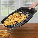 Innovative thermal base with perforated ridges enables heat to circulate around French fries for all-over browning and crispy golden results. Crossini nonstick baking sheet bakes any breaded food in the oven to a deliciously light crispy texture without frying in oil: fish sticks and fillets, shrimp tempura, chicken sticks or wings. Use this perforated pan to make healthy homemade potato chips, croutons or seasoned breadcrumbs, and easily roast vegetables, nuts and seeds without turning. End chute slides food directly onto a platter for ease in serving.Nonstick-coated steel with black exterior absorbs heat for reduced cooking times and allows quick release. Wide rim allows ease handling in and out of the oven. Oven safe up to 500 degrees F. Designed by Kaiser, leading German manufacturer of bakeware for more than 150 years. Hand wash.Product Features Thermal base with perforated ridges enables heat to circulate around French fries for all-over browning and crispy golden results Healthy way to prepare any breaded, frozen food without frying in oil: fish sticks and fillets, shrimp tempura, chicken sticks or wings Bake frozen or homemade breaded appetizers, potato chips, croutons Roast nuts, vegetables or seeds without turning End chute slides baked food directly onto a platter for ease in serving Nonstick-coated steel with black exterior absorbs heat for reduced cooking times and allows quick release of foods for easy serving and cleanup Wide rim for ease in handling